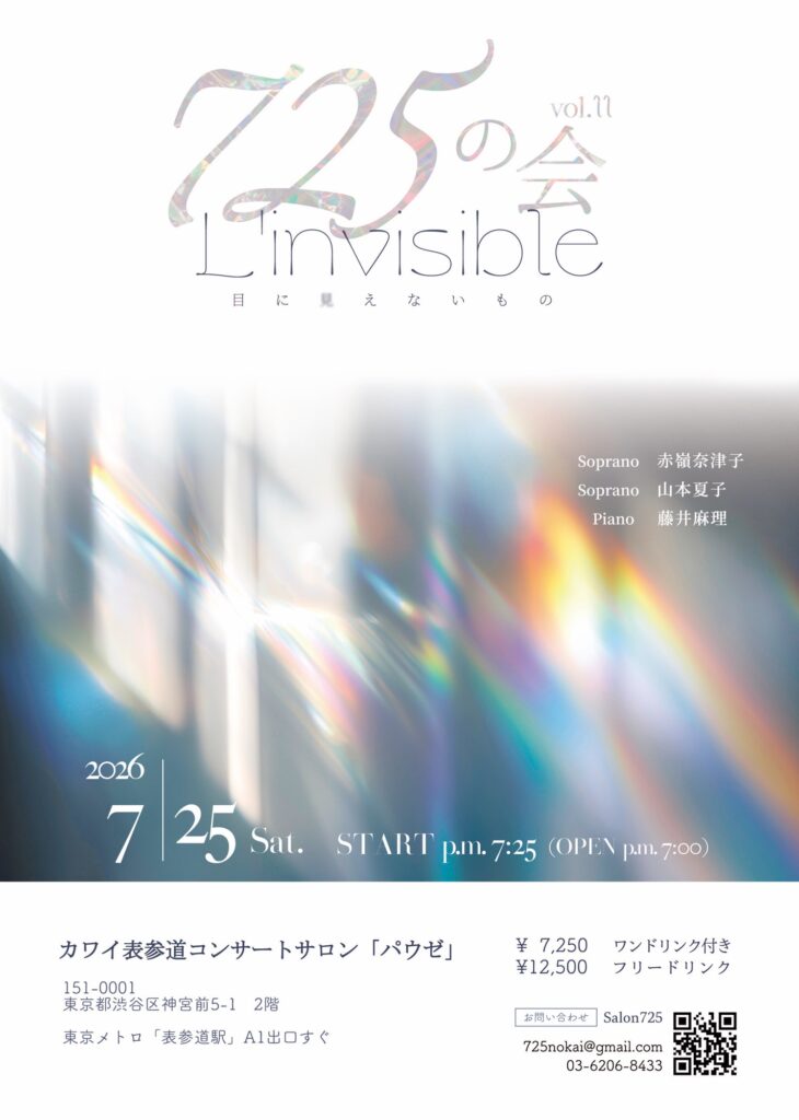 2015年から今年で11回目を迎える725の会のご案内です。赤嶺奈津子と山本夏子…ふたりのナツコによる演奏会です。毎年テーマを決めてそれに沿って選曲しています。今年は、目に見えないもの。見えないけれど感じるもの、見えないけれど存在するもの…そんな大切なものたちにフォーカスを当てました。そして演奏会に欠かせない存在のピアニストには藤井麻理さんをお迎えして、ピアノソロもお聴きいただけます。